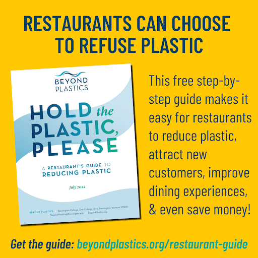 Beyond Plastics just released a free guide to help restaurants cut their use of plastic that’s at: https://www.beyondplastics.org/restaurant-guide