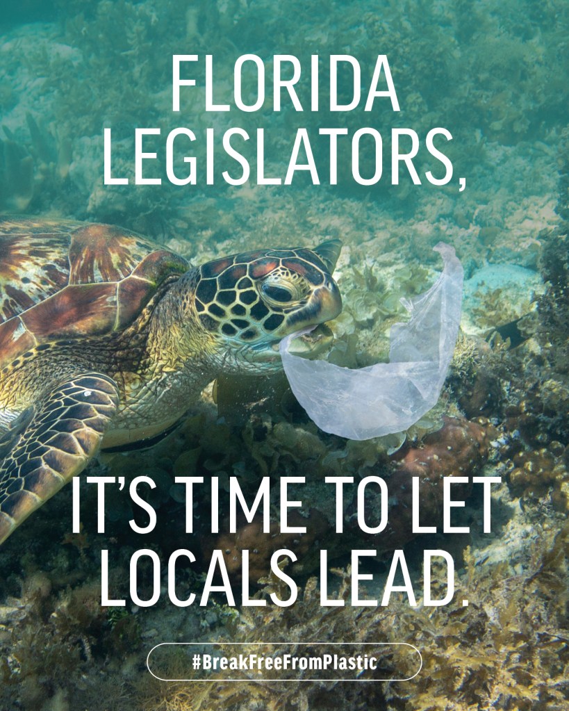With plastic production growing rapidly and polluting our water, air, and food, local governments shouldn’t be barred from deciding that enough is enough. Join me in calling on our state representatives and senators to repeal the plastic ban preemptions. This will give power back to your local communities. Go to https://plasticfreefl.org/state/ to find out more. #BreakFreeFromPlastic #RiseAbovePlastics #LetLocalsLead